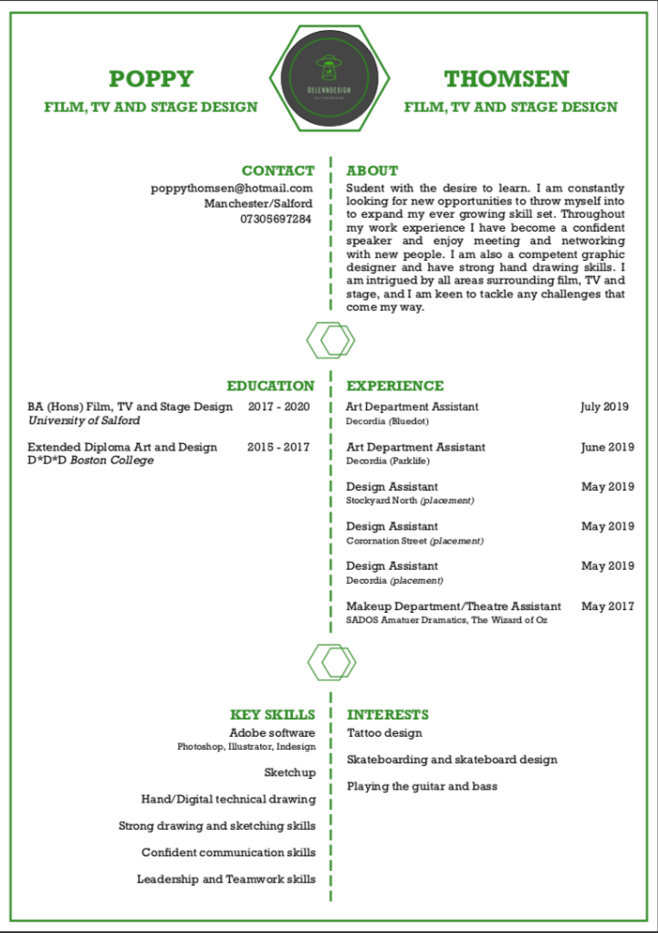 So I decided to rework my CV to add to my new and updated website because I’ve been working on uniforming my online presence so it only felt right to update my CV. I’d also worked with Decordia, an events company over the summer and into the start of 3rd year so I wanted to add that on as it felt pretty important! At first I played around with the font and thought that would be enough to change it up a bit but eventually I ended up redesigning the whole thing. I’m pretty happy with the result so far, but I do think I’m lacking on space for any other work experience. This means I’ll either have to keep my CV updated at all time or think about redesigning it to have more space for work.